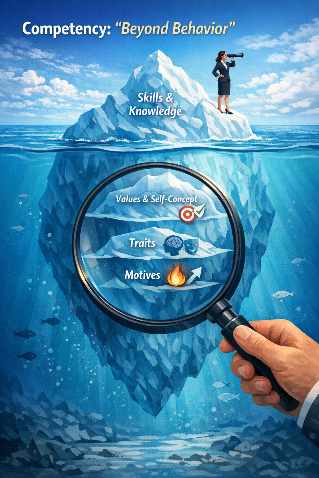 이는 지식과 기술만이 아니라 자기개념, 가치, 특질, 동기까지 포함하는 심층 구조이며, 특히 특질과 동기는 행동을 만들어내는 핵심 원인임에도 눈에 잘 보이지 않습니다.