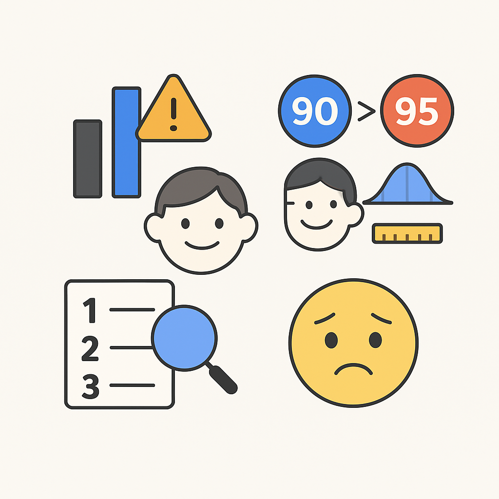 이런 문제 때문에 입시나 HR 평가는 보통 표준화 점수(z점수, T점수 등)를 사용합니다. 평균을 기준으로 얼마나 위인지, 아래인지를 같은 기준으로 바꿔주기 때문입니다. 덕분에 서로 다른 영역 점수를 비교하고 합산할 수 있습니다. 다만 응시자가 너무 적으면 평균과 표준편차 자체가 불안정해져, 결과가 흔들릴 수 있다는 점은 주의해야 합니다.