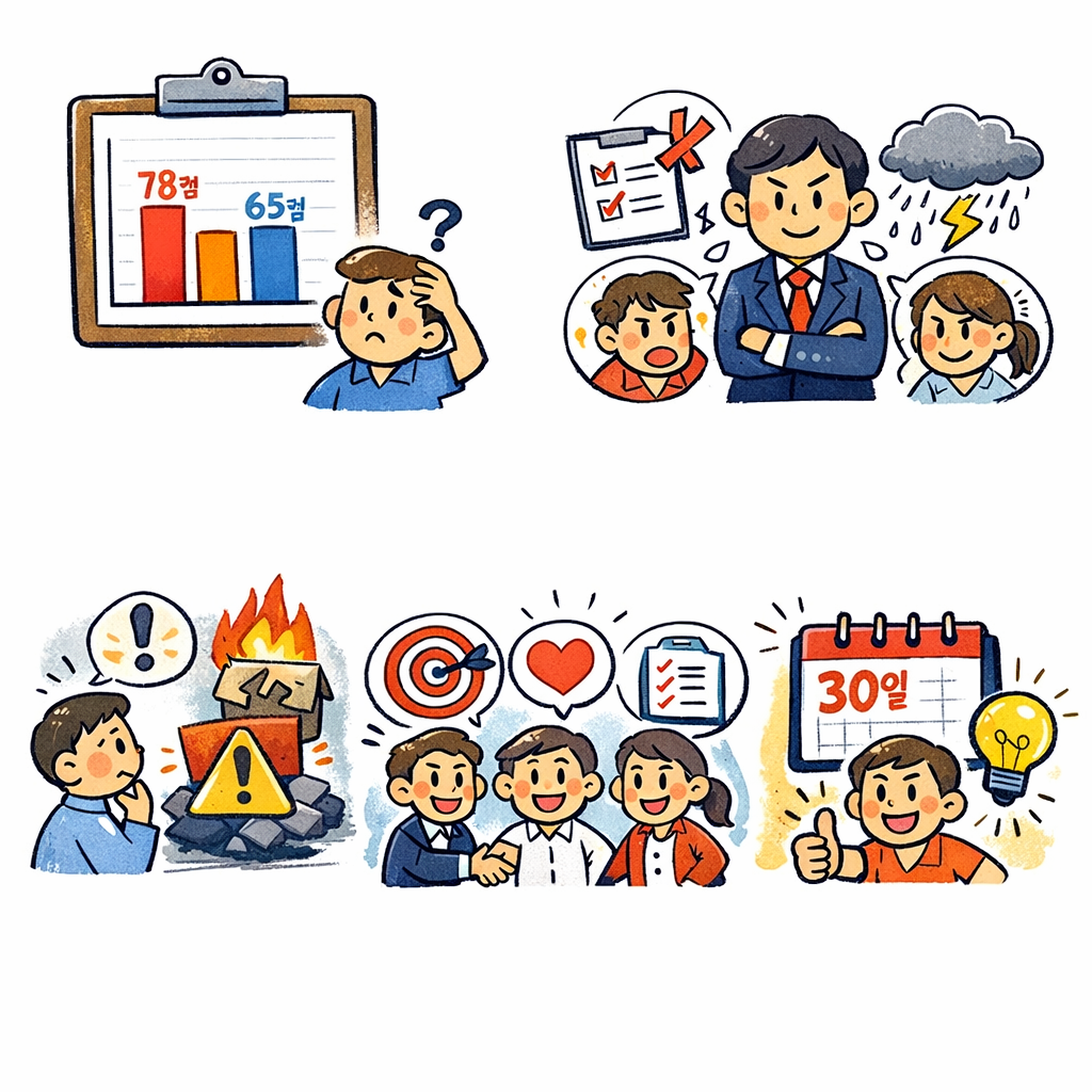 진단 점수 자체보다 중요한 것은 그 결과가 현장에서 어떤 문제로 이어지고 있는가입니다. 관계관리 부족은 이탈로, 실행력 부족은 지침 미이행으로, 자기관리 약점은 분위기 불안으로 연결됩니다. 진단은 현장 문제의 원인으로 번역돼야 합니다.