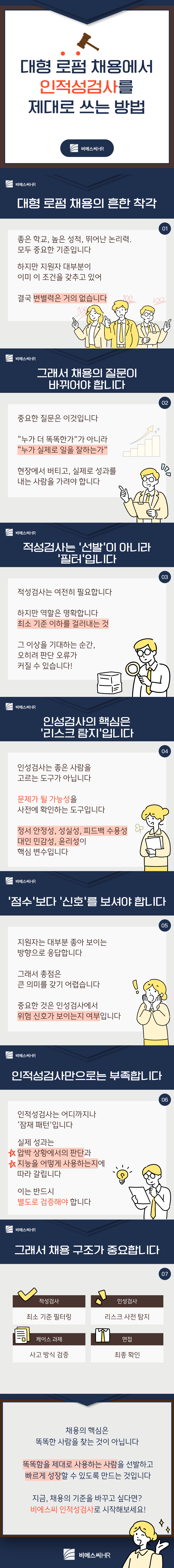 콘텐츠허브 블로그 대형 로펌 채용에서 인적성검사를 제대로 쓰는 방법👨🏻⚖️ 2026-04-23 14 지원자 모두 스펙도 뛰어나고 똑똑한데...어떻게 진짜 인재를 가려내죠?똑똑한 사람들 사이에서 변별력을 만드는 설계, 지금 바로 카드뉴스에서 확인하세요.[ 글로 읽기: https://blog.naver.com/bsc_hr/224235268550 ](글: 비에스씨 연구소) 목록보기